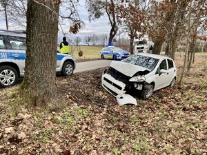 W poniedziałek (22.12.2025 r.) przed godziną 12:00 policjanci zostali powiadomieni o zdarzeniu drogowym z udziałem osobowego fiata. Pracujący na miejscu zdarzenia policjanci ustalili, że 72-letni kierujący fiatem, podczas wymijania z innym pojazdem zjechał na pobocze, przez co stracił panowanie nad pojazdem i uderzył w przydrożne drzewo. Kierujący był trzeźwy. Zarówno 72-latek, jak i jego 67-letnia pasażerka zostali przebadani przez obecnych na miejscu ratowników medycznych. Mężczyznę decyzją ratowników przewieziono do szpitala. Szczęśliwie uczestnicy tego zdarzenia nie odnieśli poważnych obrażeń. Policjanci zatrzymali dowód rejestracyjny uszkodzonego fiata. Na miejscu pracowała grupa dochodzeniowo-śledcza wraz z technikiem kryminalistyki.